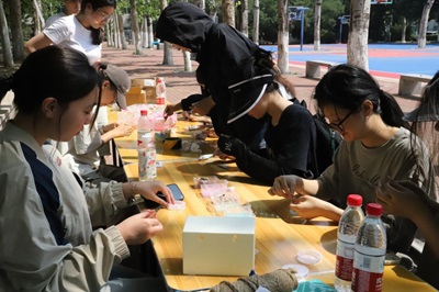 活动设计互动体验环节,将美育融入沉浸式体验场景。同学们在“百变发卡”的色彩搭配与造型设计中激发创意;在“珠圆玉润·手工串珠”中感受手工艺术的韵律之美;在“沙包投洞趣味赛”中释放多样的情绪;在“植物拓染”的自然晕染中创作独一无二的艺术作品,体悟自然美与工艺美的融合。