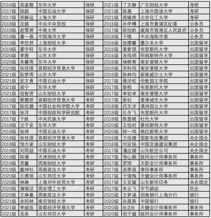 本科生一次就业率在90%以上,主要去向是农行、招商、浦发等金融机构,中国重汽、鲁能集团、蒙牛集团等知名企业和信永中和、瑞华、立信等会计师事务所。近15%的优秀毕业生考取厦门大学、中国人民大学、山东大学、中国海洋大学、东北财经大学、天津财经大学等知名高校的研究生。近10%的毕业生考取财政、税务、人社等部门或系统的公务员。近5%员工到加州大学、纽约大学等国外大学留学。为提高员工“两创”能力,实施“一生一赛”措施,鼓励老员工参加各类大赛,近三年获得省级以上科技创新竞赛奖80余项,其中CIMA全球商业精英挑战赛(GBC)华东区域决赛冠军,全国“挑战杯”创业计划大赛铜奖1项、全国老员工会计信息化技能大赛全国一等奖2项。